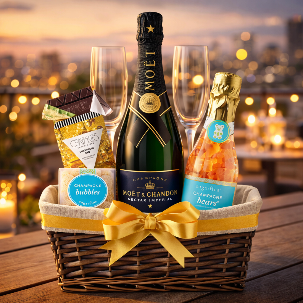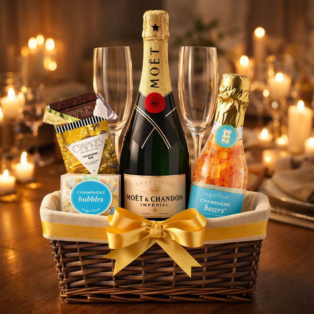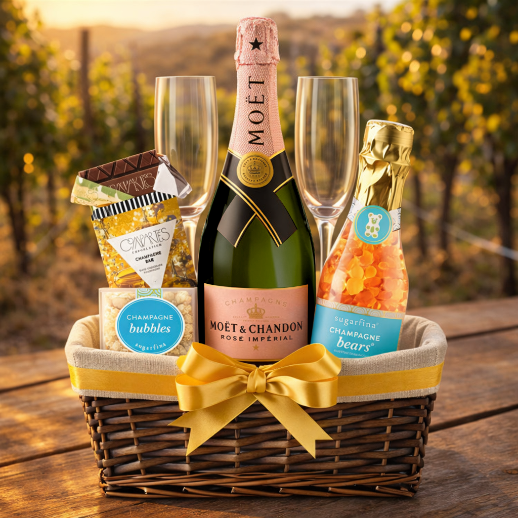 Celebrate in style with this elegant champagne gift set, featuring a premium bottle of champagne, a customizable set of two flutes, Compartés chocolate, and Sugarfina candies—all beautifully packaged for a sophisticated gifting experience. Perfect for weddings, anniversaries, and special celebrations.