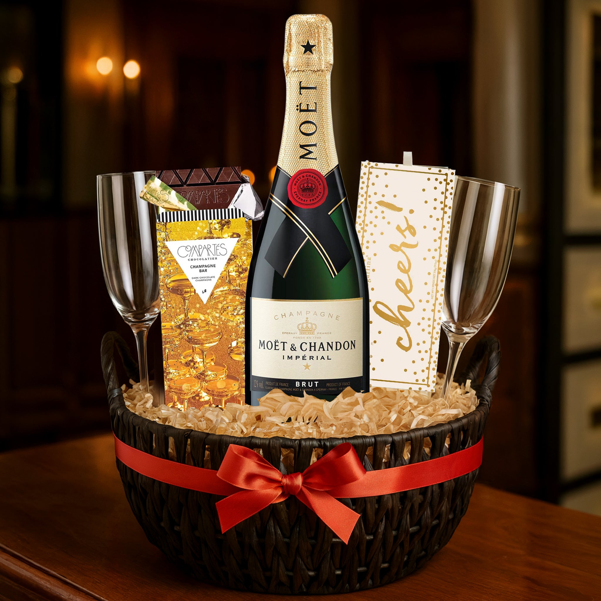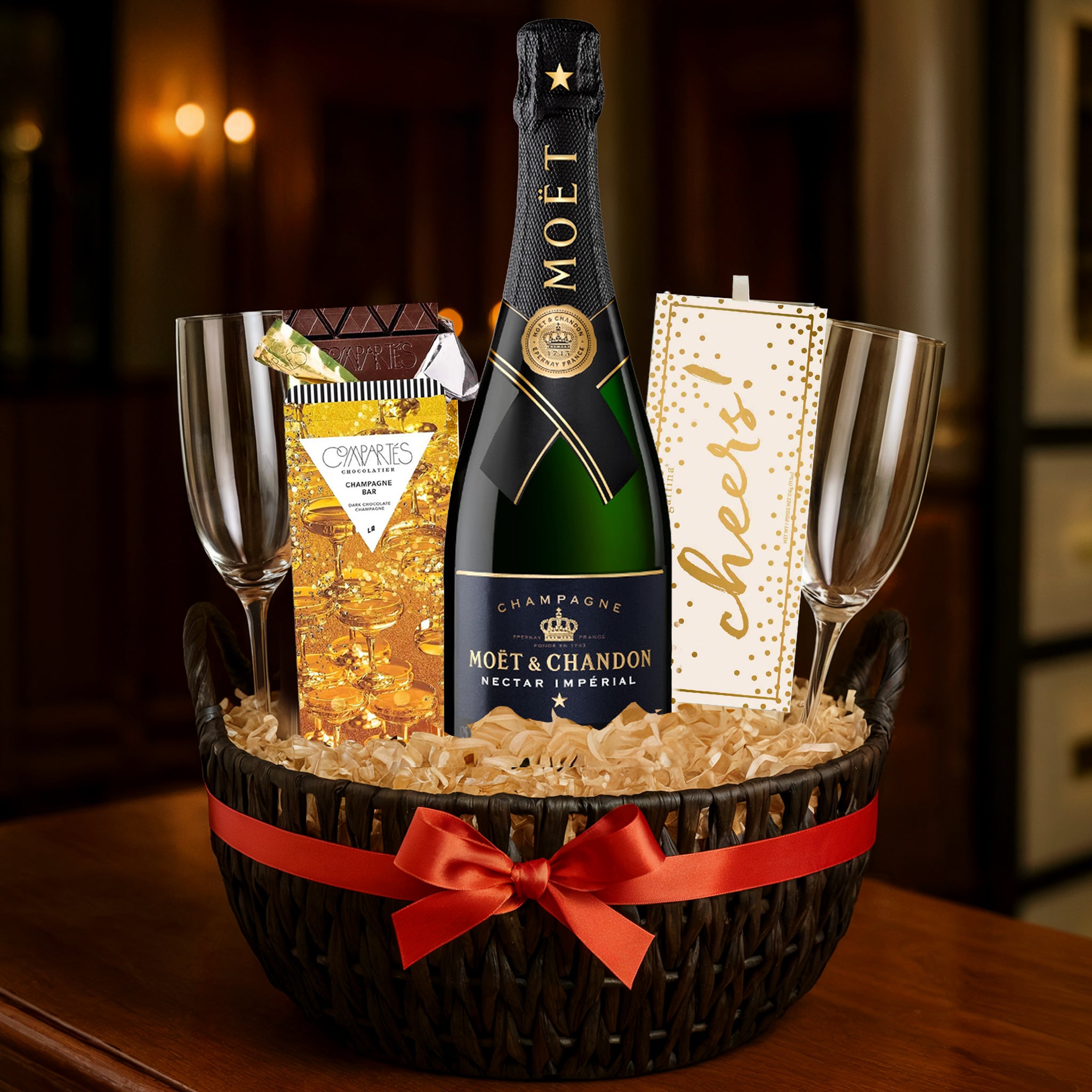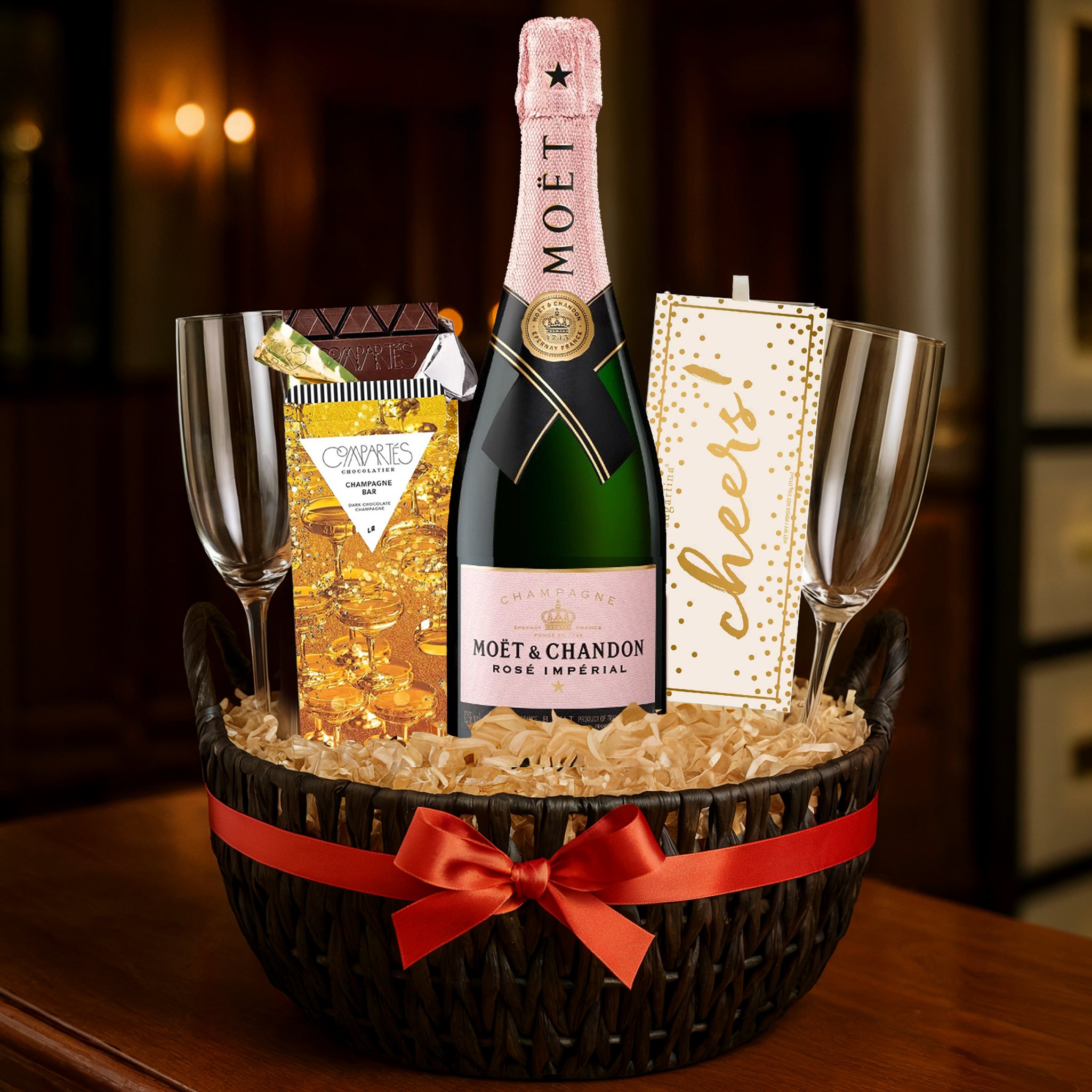 Celebrate in style with this elegant champagne gift set, featuring a premium bottle of champagne, a customizable set of two flutes, Compartés chocolate, and Sugarfina candies—all beautifully packaged for a sophisticated gifting experience. Perfect for weddings, anniversaries, and special celebrations.